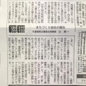 新着情報|2019.04.03 【岐阜新聞「素描」第5回】 3月から8週にわたり岐阜新聞のコラム「素描」の水曜日を担当させていただいております。 第5回目のタイトルは、「まちづくり会社の誕生」。 美濃市に寄贈された旧松久才治郎邸の再生事業をきっかけに、まちづくり会社として「みのまちや株式会社」が誕生。 今回の事業では、丸重製紙としても当物件に和紙専門店をオープンさせ、〝世界中から美濃市に和紙を求めて人が集まる場〟を生み出します。 ぜひご一読いただけると幸いです。 前へ < 新着情報一覧に戻る > 次へ